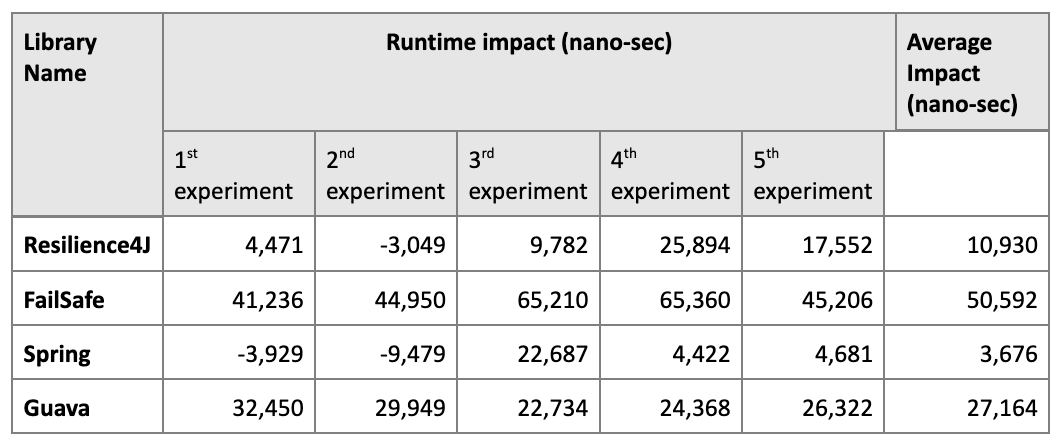It’s important to consider runtime differences that each library adds to the total process execution. We estimated that such an impact is generally small, so in order to calculate accurately, we had to measure total time of multiple executions and then divide that time by the number of executions. Specifically, we measured the time it took for 100 calls to a sample service that never throws an exception, with and without a retry framework. The difference between these times divided by 100 measures the runtime impact of the library. As our local machine could be running background processes that could interfere with the measurements, we ran each test five times, so the average result would be a close approximation of real runtime impact. Below are the tables that describe our results: